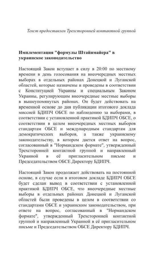 Дипломат Роман Безсмертний оприлюднив текст так званої "формули Штайнмаєра", яку планують підписати на зустрічі Тристоронньої контактної групи.