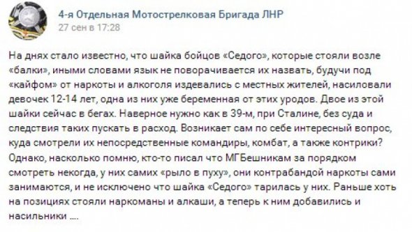 "Зграя бійців "Сєдого", які стояли біля "балки", іншими словами язик не повертається їх назвати, будучи під "кайфом" від наркоти й алкоголю, знущалися з місцевих жителів, ґвалтували дівчаток 12-14 років, одна з них вже вагітна від цих виродків. Двоє з цієї шайки зараз у бігах", - пишуть у групі.