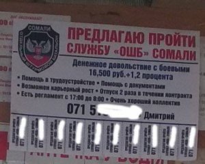 Оголошення про пошук найманців в незаконне збройне формування "Сомалі" бойовики розклеїли в маршрутках Донецька. Про це повідомили Вартові Еспресо у Telegram.