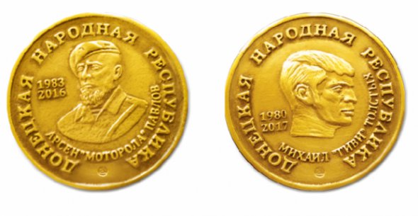 "На аверсі монет викарбувані портрети загиблих терористів Арсена Павлова ("Моторола") та Михайла Толстих ("Гіі"), їх імена з позивними, а також дати народження та смерті. На реверсі монет зображено "герб" так званої "ДНР", - йдеться у повідомленні.