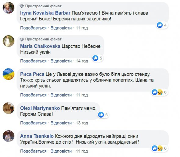 "Дуже важко було біля цього стенду. Важко крізь сльози вдивлятися в обличчя полеглих. Повага і низький уклін", "Щодня йдуть кращі сини України. Боляче до сліз! Низький уклін вам, рідні", "Відвідала храм навесні. Підійшла до стенду – перехопило подих. Сльози мимоволі текли по щоках. Сказати ні слова було неможливо. Шкода. Дуже шкода, що стільки людей, обличчя яких дивилися на мене зі стенду, полеглих і які досі гинуть за нашу свободу, за мир в Україні", "Ніхто не забутий, ніщо не забуте. Низький уклін вам, сини України. Спіть спокійно, Герої України", "Знаєте, що вражає ще в цьому храмі? Портрети дітей, чиї батьки віддали життя за нас із вами", – пишуть люди.
