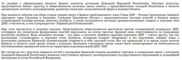 "Представники громадськості виступили проти гуманітарної підтримки ДНР, мотивуючи це спробами федеральної влади перекласти на плечі простих брянців свою відповідальність за зміст "республік" Донбасу. Адже надавати допомогу - це одне, а допомагати наповнювати кишені верхівці ДНР - зовсім інше, так як реалізація "гуманітарки" в торгових мережах Донбасу, якими володіють Захарченко та його оточення, говорить лише про можливі спроби Брянської адміністрації відщипнути і собі ласий шматок", - сказано в повідомленні.