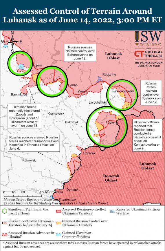 "Попри те, що збройні сили Білорусі 14 червня розпочали командно-штабні навчання, країна навряд чи розпочне бойові дії проти України на боці Росії. Незважаючи на відсутність підтримки на тимчасово окупованих територіях, РФ намагається прискорити процес анексії, проте не має конкретного плану щодо цього", - ідеться у звіті аналітиків.