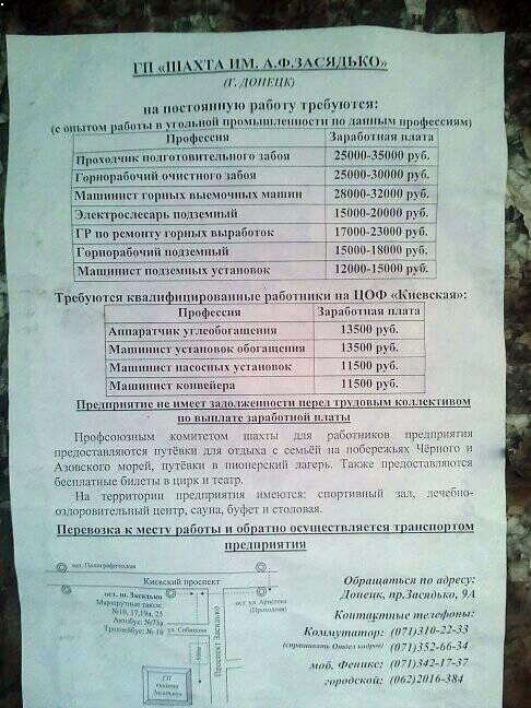 В окупованому Донецьку на шахті імені О. Ф. Засядька прохідникам підготовчого вибою обіцяють платити 25-35 тисяч рублів щомісяця (10250-14350 грн).
