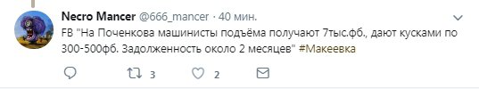Відповідно до коментарів, на іншій шахті ім. Поченкова, яка входить в холдинг "Макіїввугілля", зарплату в 2800 грн видають по 120-205 грн на руки за раз. Заборгованість перед працівниками становить 2 місяці, пише "Обозреватель".