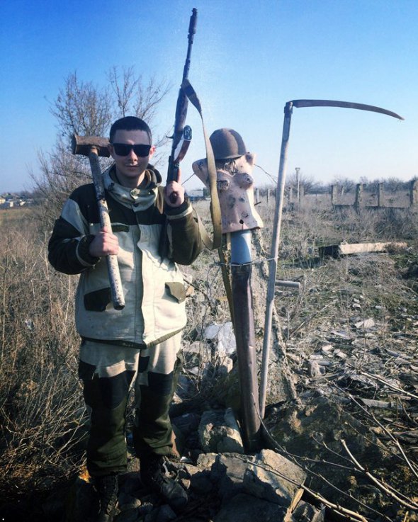 У мережі з'явилося дивне фото члена незаконних збройних формувань на Донбасі. На ньому бойовик позує на фоні руїн паркану, в камуфляжному костюмі і сонцезахисних окулярах. В одній руці тримає автомат, в іншій молот.