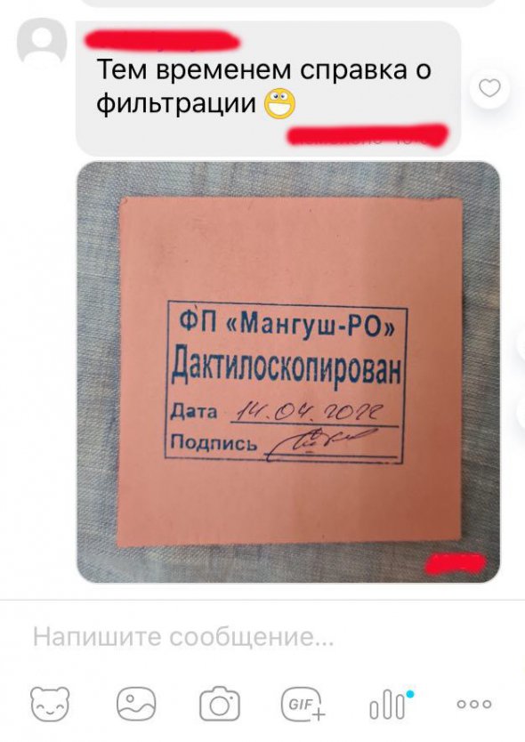Шматок паперу, на якому стоїть штамп про фільтрацію, показав радник мера Маріуполя Петро Андрющенко в Telegram.