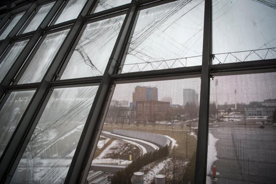 Дорогий футбольний газон засипало снігом, а пошкоджене в результаті вибухів скло будівлі так і не відновили.