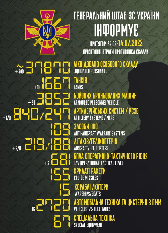 Втрати російських окупантів в Україні на 14 липня становлять 37 870 осіб.