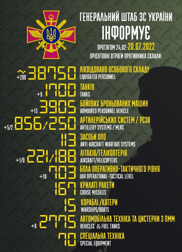 Втрати російських окупантів в Україні на 20 липня становлять 38 750 осіб.