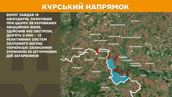 Сили оборони України продовжують операцію в Курській області. Минулої доби ворог завдав 19 авіаударів, скинувши при цьому 28 керованих авіаційних бомб, здійснив 492 обстріли, дев'ять з них - із реактивних систем залпового вогню. Українські захисники зупинили 25 штурмових дій загарбників.
