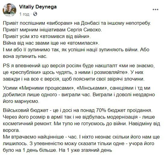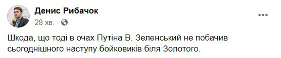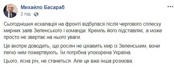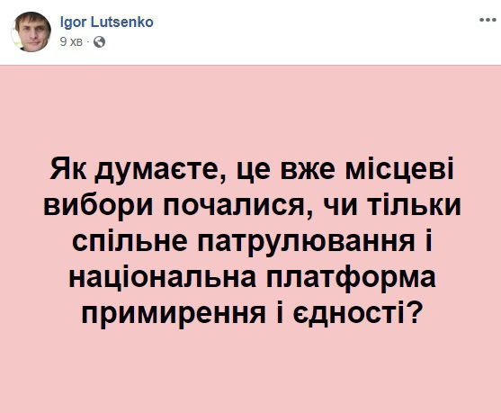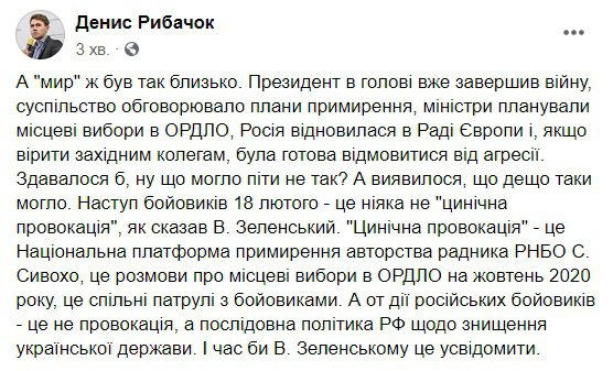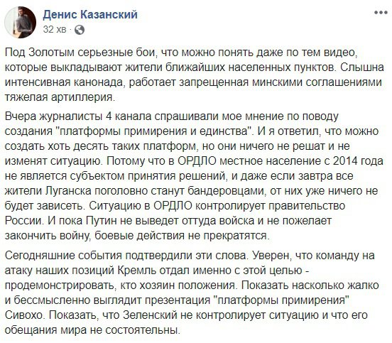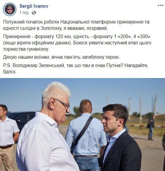 І це через день після того, як радник секретаря РНБО Сергій Сівохо анонсував запуск "Національної платформи примирення і єдності" із ОРДЛО. Та на фоні заяв головнокомандувача про те, що у його голові війна закінчилася, і що Україна готова до спільного з бойовиками патрулювання кордону.