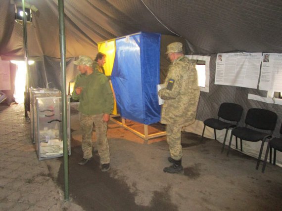 На одній з дільниць, яка розташована у підрозділі, котрий базується поблизу Донецька - голосування проходить спокійно. Хлопці і дівчата голосують, черг не має. Все відбувається в наметі. За виборами спостерігають представники преси. Дехто з бійців приходить прямо з позицій, голосує і повертається. В день не стріляли, тому ситуація була спокійна.