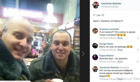 "Бабенко не тільки позує у формі "флора", але й сміливий у коментарях. На фотографії, завантаженій також 14 лютого, є коментар російського солдата "Їдемо з України на Кавказ!!!". Бабенко - солдат строкової служби призову осені 2016 року, а не військовослужбовець за контрактом, яких ми так часто зустрічаємо в "українських відрядженнях", - зазначають автори публікації.