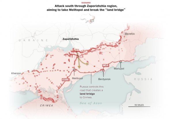 Величезна лінія фронту створює безліч потенційних напрямів для атаки. Україна могла б зосередити зусилля на півдні та спробувати захопити Мелітополь, який Росія зробила окупованим обласним центом Запорізької області, а потім рушити далі, намагаючись перерізати "сухопутний міст".