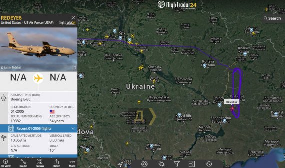 Третій розвідник наразі сканує східні райони України. Вже кілька годин американський літак управління та цілевказівки Boeing E-8C висить у трикутнику Харків – Дніпро – Донецьк.