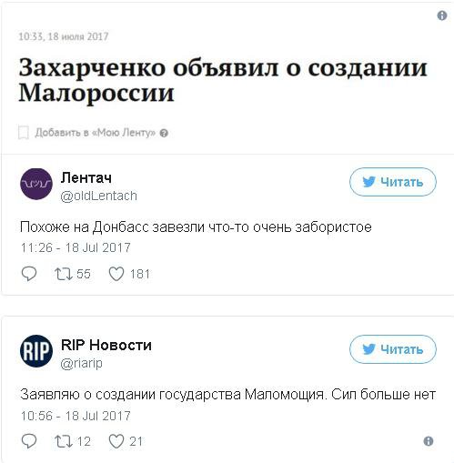 18 липня ватажок ДНР Олександр Захарченко оголосив про створення "перехідної держави Малоросія". Бойовики створили "конституційний акт Малоросії", відповідно до якого "Київ збереже за собою статус історико-культурного центру", а окупований Донецьк буде "столицею". Прапором так званої Малоросії терористи визначили прапор Богдана Хмельницького.