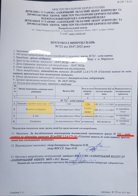 "Вода має в своєму складі коліформи. Простою мовою: воду набирають у відкритих водоймах (річка, озеро), вода змішана з фекальною речовиною. Така вода є загрозою та передумовою виникнення інфекційних хвороб (зокрема дизентерії)", – зазначив Андрющенко.