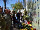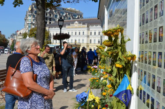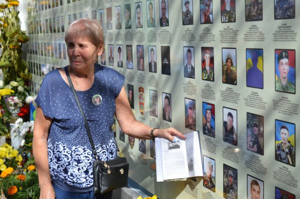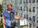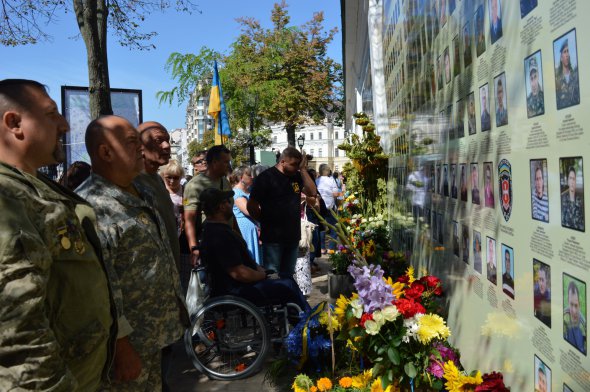 До самої стіни не проштовхнутися - навколо неї зібралися близькі друзі, побратими та родичі загиблих. Більше за все людей зібралося під стендом з назвою "Серпень - вересень 2014 року". Здебільша це жінки, що тримають портрети загиблих дітей чи чоловіків та пару квітів: гвоздики чи соняшники, як символ Дня пам'яті захисників. В їх очах біль та туга.