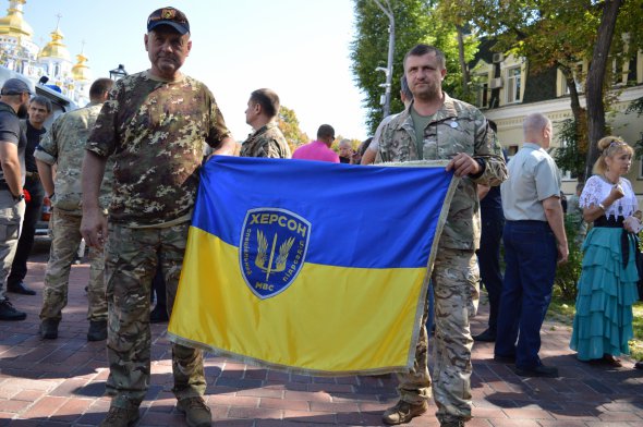 Вони демонструють свій прапор. На синьо-жовтому стязі напис "Херсон".