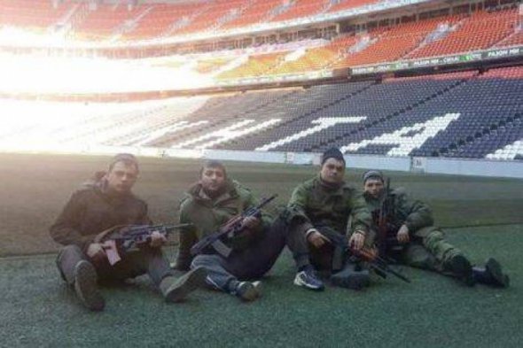 На головній футбольній арені Донецька терористи сіли позувати для фото разом зі зброєю. На знімку видно, як газон починає заростати бур'янами.