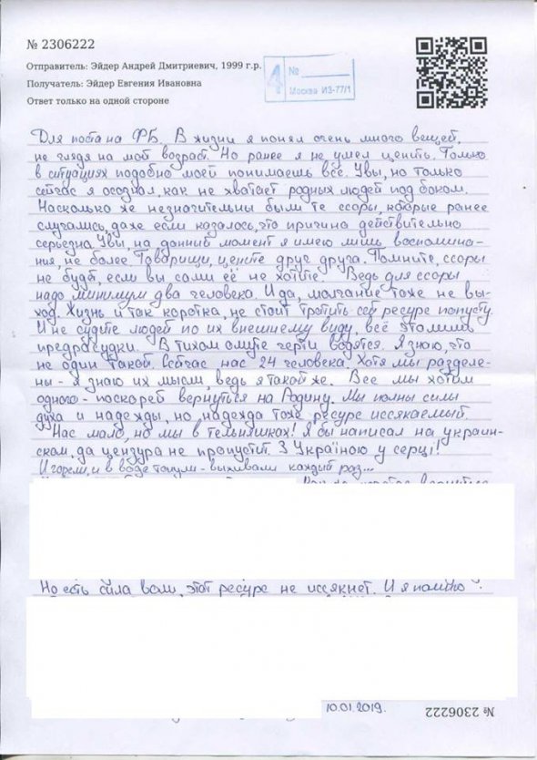 19-річний Андрій Ейдер, один із захоплених Росією 25 листопада у Керченській протоці моряків, написав лист.
