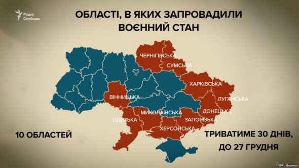 Воєнний стан ввели у Вінницькій, Луганській, Миколаївській, Одеській, Сумській, Харківській, Чернігівській, а також Донецькій, Запорізькій, Херсонській областях.