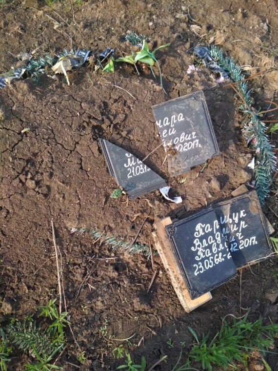 "Поїхали на міське кладовище навести порядок на могилі родичів. Побачили таку картину. Це капець просто. Судячи зі слідів, машина велика і, схоже, з ковшем. А водій, швидше за все, був п'яний, тому що в нормальному стані так наколобродити нереально", - каже місцева жителька Катерина.