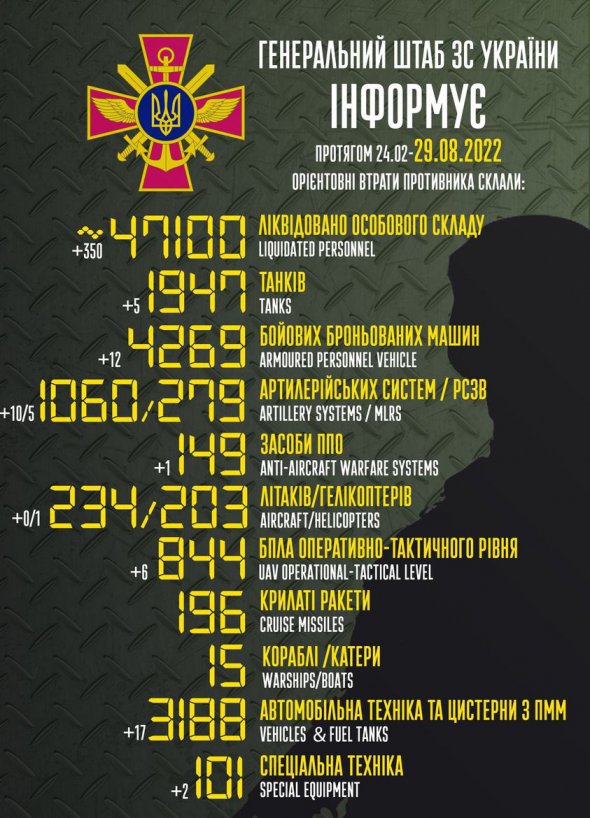 Втрати російських окупантів в Україні на 29 серпня становлять 47,1 тис. осіб.