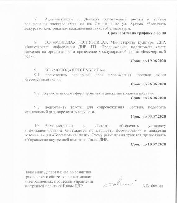 Зокрема, в ньому від так званого міністерства освіти та науки ДНР вимагають надати окупаційній адміністрації Донецька заявку на доставку курсантів "Донецького вищого загальновійськового командного училища" та ліцеїстів "Донецького ліцею-інтернату з посиленою військово-фізичною підготовкою" для участі в репетиціях і параді.