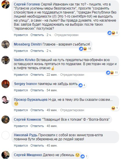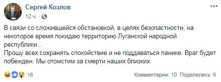 "У зв'язку зі сформованою ситуацією, в цілях безпеки, на деякий час залишаю територію Луганської народної республіки. Прошу всіх зберігати спокій і не піддаватися паніці. Ворог буде переможений. Ми помстимося за смерті наших близьких", - написав у прощальному пості Козлов.