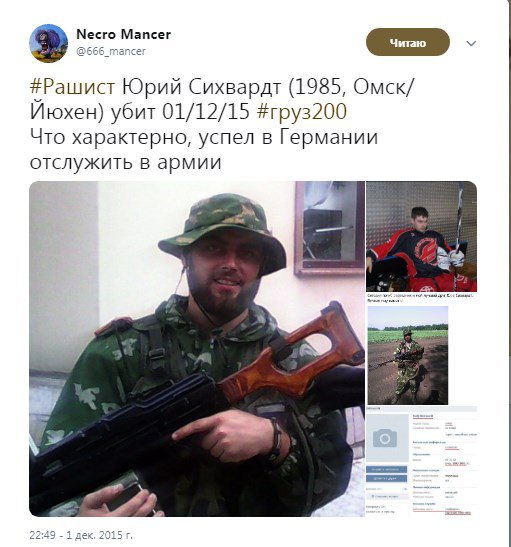 "Рашист Юрій Сіхвардт (1985, Омськ/Йюхен) убитий 01/12/15 # груз200. Що характерно, встиг у Німеччині відслужити в армії", - йдеться в підписі під фото ліквідованого бойовика.