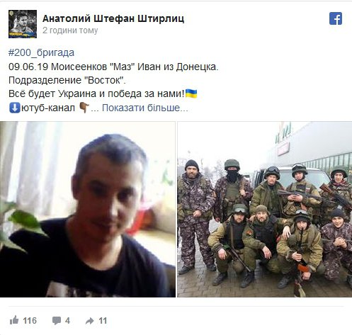 "200-а бригада 09.06.19, Моїсеєнков "Маз" Іван з Донецька. Підрозділ "Восток", - йдеться у повідомленні.