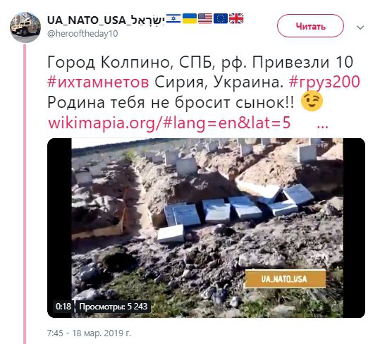 "Місто Колпіно, СПБ, РФ. Привезли 10 іхтамнєтов - Сирія, Україна. Батьківщина тебе не кине синку!", - йдеться в підписі до ролика в Twitter.
