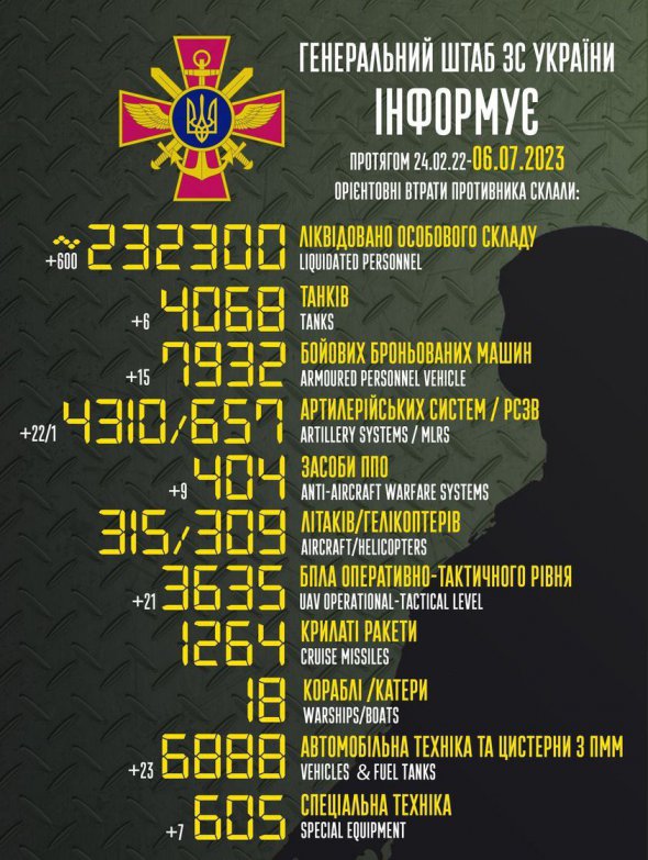 Загальні бойові втрати Росії на ранок 6 липня становлять уже понад 232 300 окупантів.