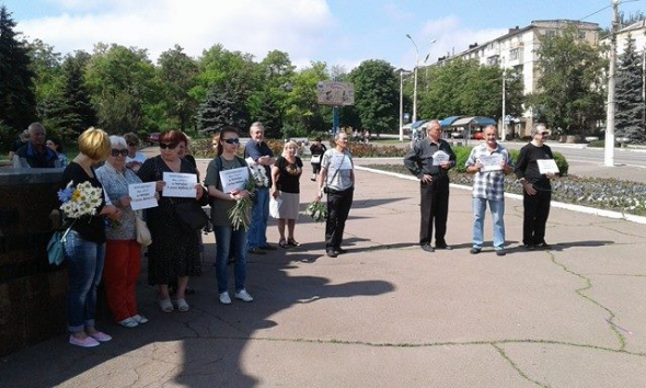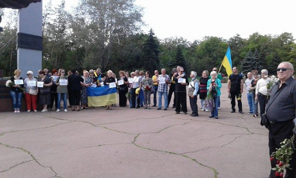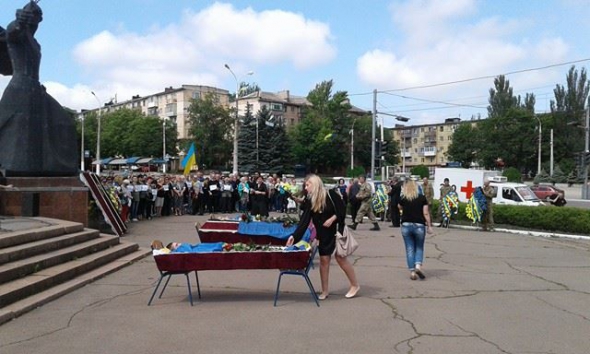 У центрі міста біля пам'ятника воїнам-визволителям попрощалися з трьома військовослужбовцями 56-ї бригади, які загинули 29 травня під час обстрілу селища Гнутове.