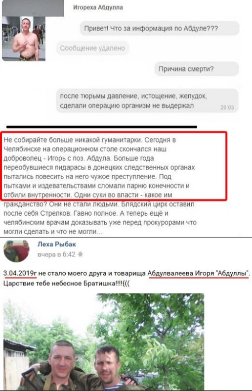 "Не збирайте ніякої гуманітарки. Сьогодні у Челябинську помер Ігор Абдулвалієв ( Абдула). Більше року потвори намагалися повісити чужий злочин. Під тортурами поламали йому щелепу., відбили внутрішні органи та кінцівки. Яке їм громадянство? (ймовірно мається на увазі громадянство РФ - ) Цей цирк залишив після себе Стрелков", - пише його поплічник.