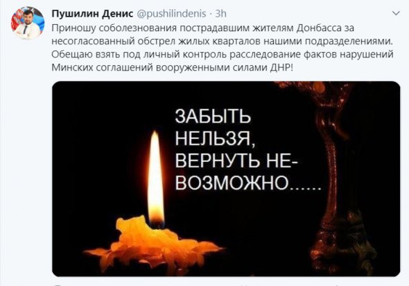"Приношу співчуття постраждалим жителям Донбасу за неузгоджений обстріл житлових кварталів нашими підрозділами. Обіцяю взяти під особистий контроль розслідування фактів порушень Мінських угод збройними силами ДНР", - було написано в повідомленні на сторінці Пушиліна в Twitter.