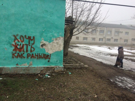 У місті Свердловськ Луганської області, яке перебуває під контролем так званої ЛНР, на стінах будинків з'явились написи: "Путін, виведи війська", "Хочу жити як раніше!", "Свердловськ буде український!".