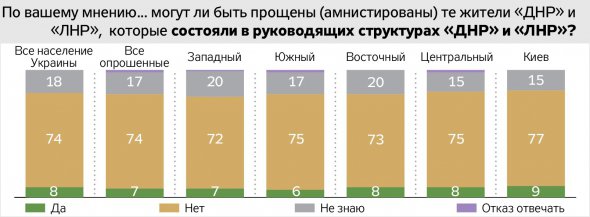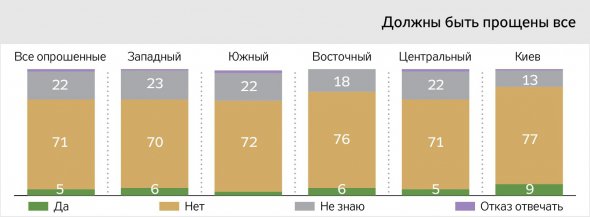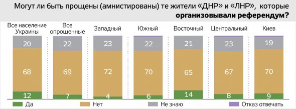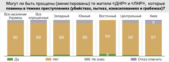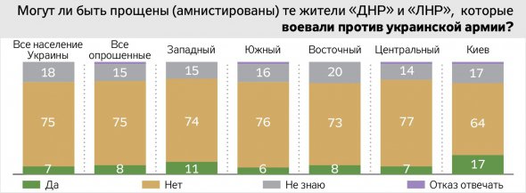 Переважна більшість родичів загиблих бійців впевнені: не можуть бути прощені особи, винні у тяжких злочинах, скоєних під час війни. Дві третини опитаних вважають, що не заслуговують прощення (амністії) ті, хто воював проти українських військових. Майже стільки ж не вважають за можливе прощати верховодів псевдонародних республік. Абсолютна більшість виступає за покарання організаторів референдуму.