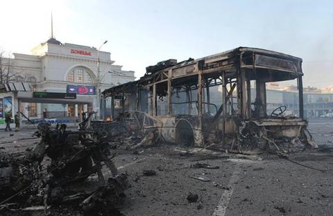 На них видно згорілий каркас автобуса біля головного вокзалу Донецька. Навколо чорна земля і вирви від снарядів.