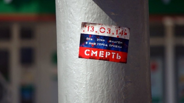 На іншому фото - наліпка-триколор з написом "Под этим флагом в наш город пришла смерть".