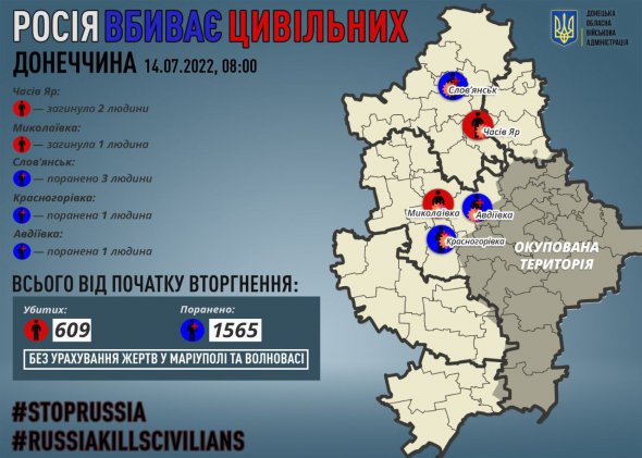 Протягом 13 липня російські військові вбили щонайменше трьох мирних жителів Донеччини.