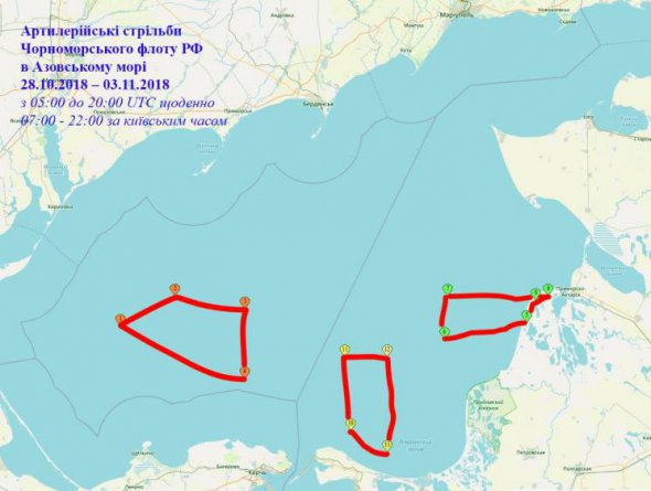 "В період 28.10.2018 - 03.11.2018 з 05:00 до 20:00 UTC (зимовий київський час = UTC+2) щоденно в Азовському морі відбудуться навчання Чорноморського флоту РФ з артилерійськими стрільбами в районах, що вказані на карті. Прибережний припис опублікований в міжнародній системі NAVTEX", - пишуть експерти.