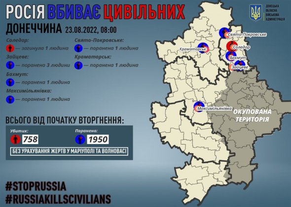 Від початку повномасштабного вторгнення терористи вбили щонайменше 758 мешканців Донеччини, ще 1950 осіб зазнали поранень від рук загарбників.