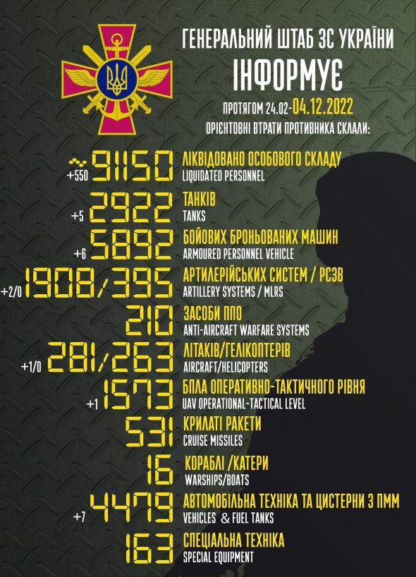 Загальні бойові втрати Росії на ранок 4 грудня становлять 91 150 осіб.