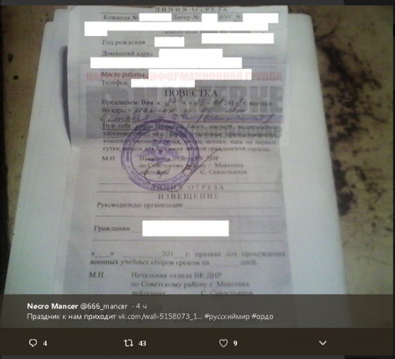 В окупованій Макіївці Донецької області шахтарі отримали повістки на військові навчання в так званій ДНР.