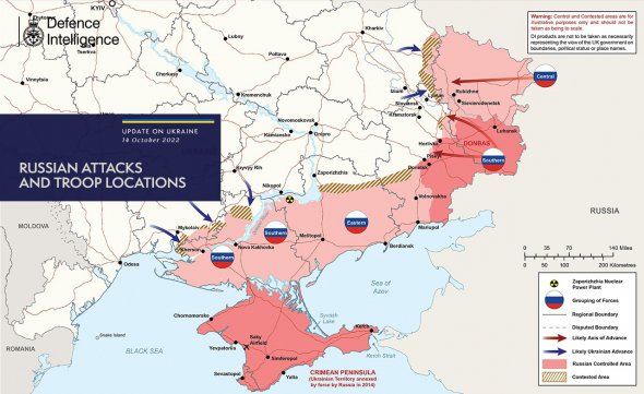 Водночас російські окупанти намагаються зламати оборону ЗСУ у районі Бахмута на Донеччині, свідчить свіжа карта бойових дій, яку опублікувало міністерство оборони Великої Британії Twitter 14 жовтня.