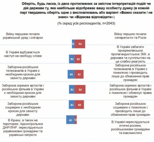 "52 відсотки дотримуються думки, що війну почали Росія та сепаратисти. Водночас 15 відсотків опитаних покладають провину на Україну, а третина має невизначену думку; враховуючи, що від початку війни минули чотири роки, це є негативним фактом", – йдеться у звіті.