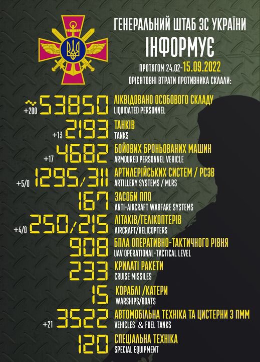 Втрати російських окупантів в Україні на 15 вересня становлять 53 815 осіб.